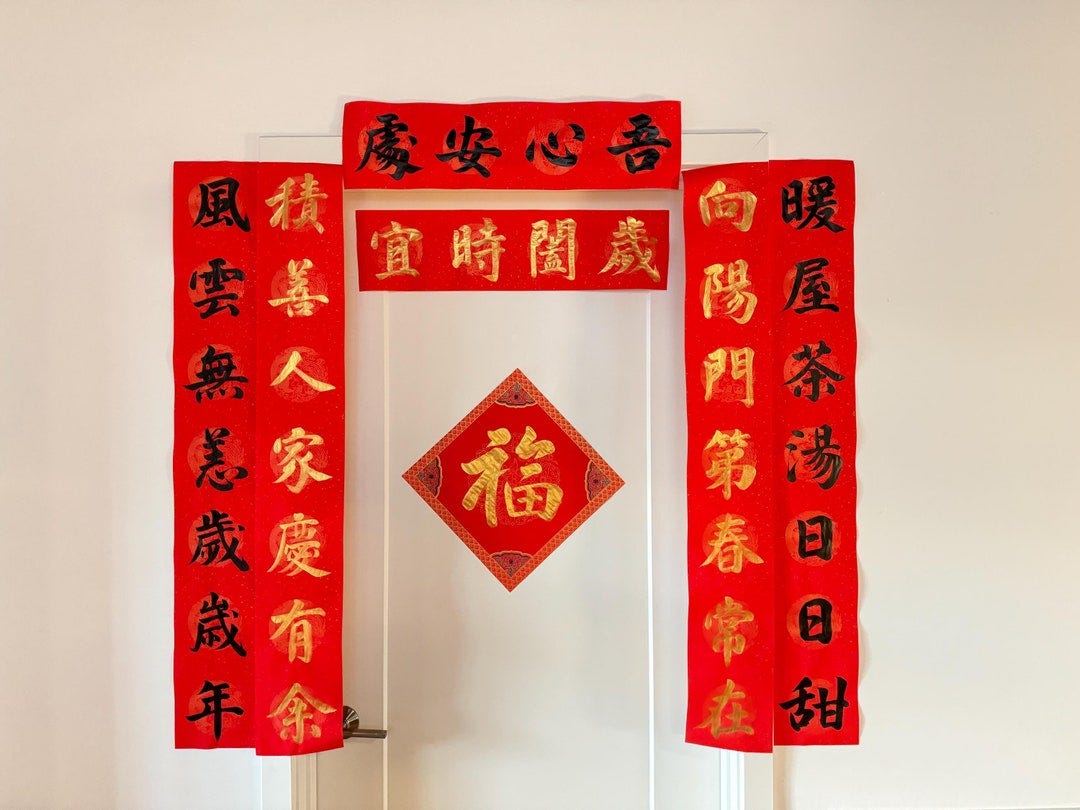 Common customs in preparation for the new year include a deep clean of the house prior to its arrival, (eg sweeping dust outwards, representing ridding old qi, washing bedding and any places turbidity can get stuck and accumulate); decorating with red which represents yang and repels negative energies, hanging spring couplets on door frames for prosperity and health; preparing foods like dumplings, rice cakes and long noodles symbolizing health and longevity, etc.